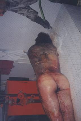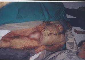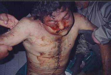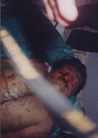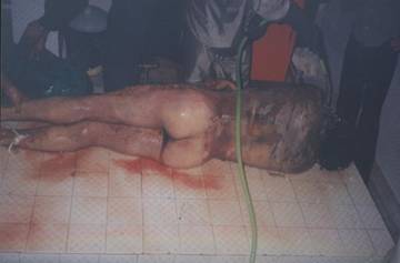 According to sources close to the family, his intenstines werehanging out when the body was delivered to the family; he was sewn upfor burial.
